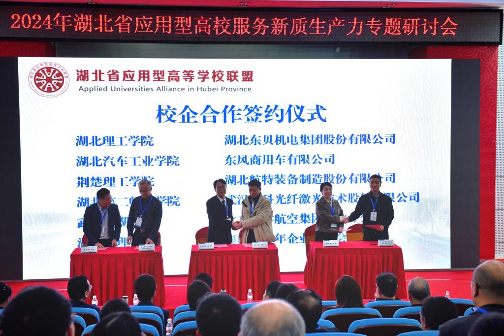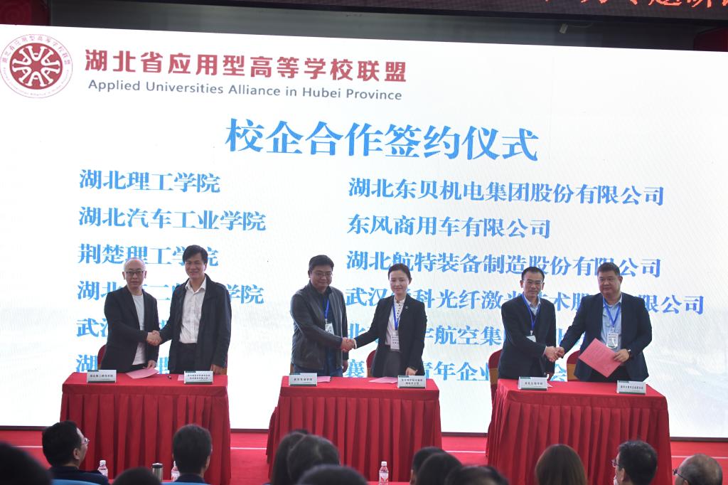 学校与襄阳市青年企业家协会、湖北理工学院与湖北东贝机电集团股份有限公司、湖北汽车工业学院与东风商用车有限公司、荆楚理工学院与湖北航特装备制造股份有限公司、湖北第二师范学院与武汉锐科光纤激光技术股份有限公司、武汉东湖学院与北京翔宇航空集团湖北分公司等单位举行校企合作签约仪式。
