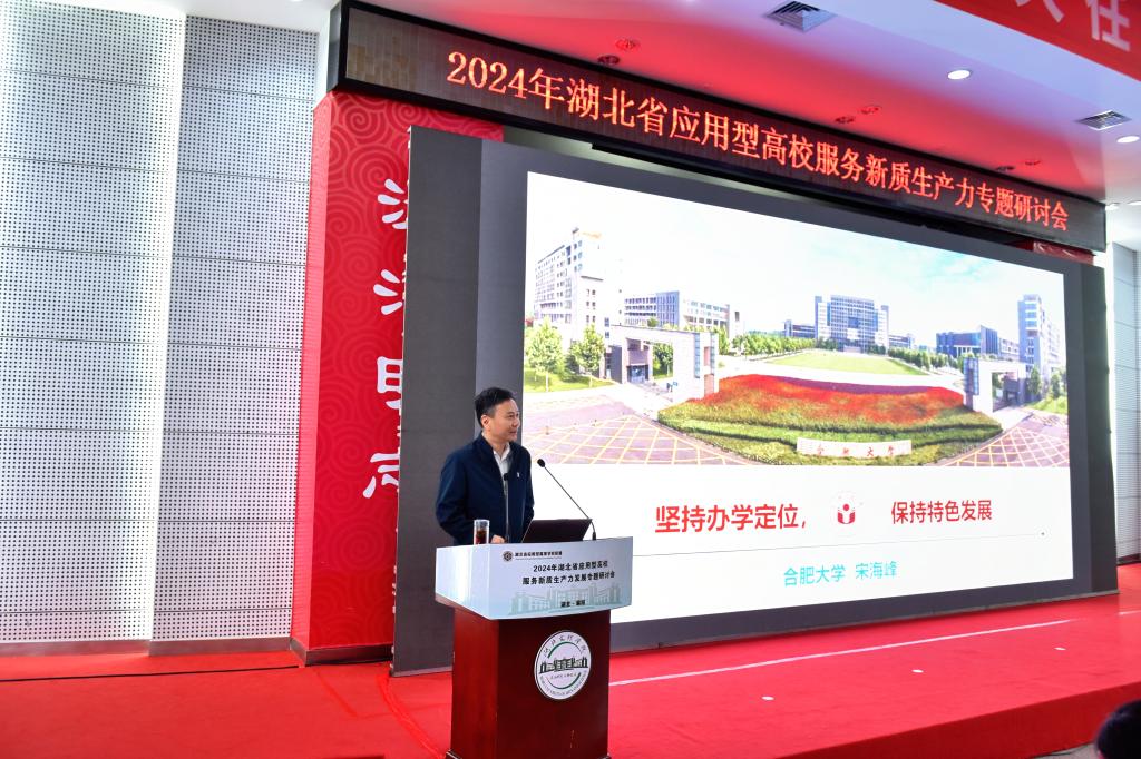 研讨会专家讲座及主题发言环节由学校副校长汪云主持。专家讲座阶段,安徽省应用型本科高校联盟秘书长、合肥大学发展规划处处长宋海峰作题为《坚持办学定位 保持特色发展》的专题讲座。宋海峰结合合肥大学的办学历程和特色定位,介绍了合肥大学通过持续发力、加强对外交流合作等方面的努力,推动应用型大学高质量发展,提升应用型大学服务新质生产力发展能力的经验。