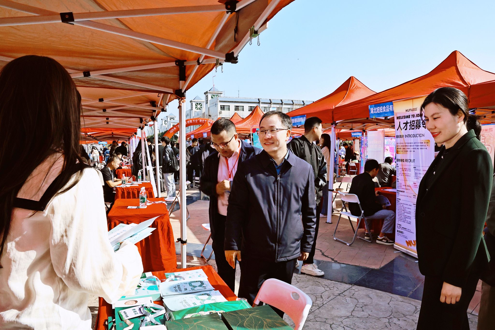 张樊、杭波、张耀辉一行在招聘现场,与枣阳市教育局、湖北妞妞食品有限公司等十余家企业负责人深入交流,洽谈校企合作事宜。